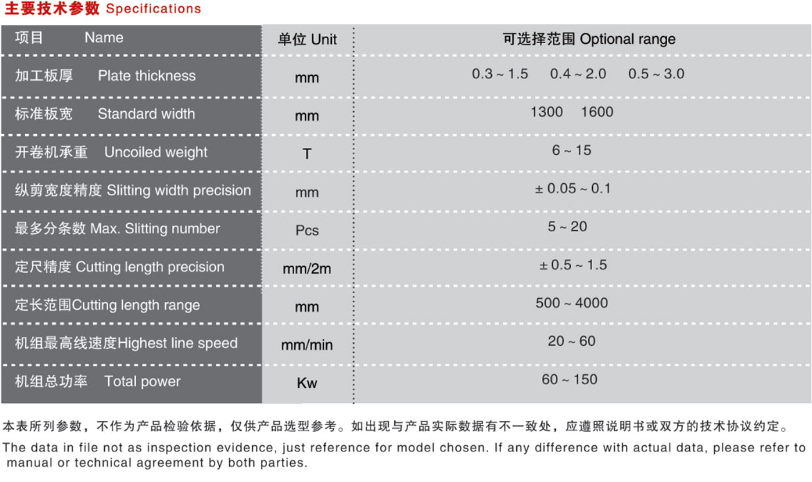由上料小車、開(kāi)卷機(jī)、引頭裝置、牽引夾送及校平、緩沖活套、對(duì)中裝置、定長(zhǎng)送料-縱剪主機(jī)、剪板機(jī)、輸送出料、落料裝置等組成。