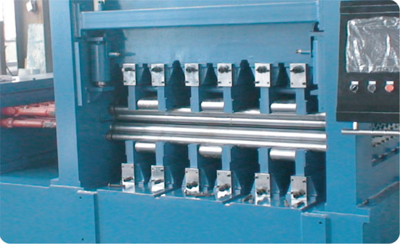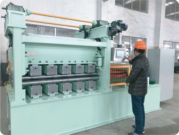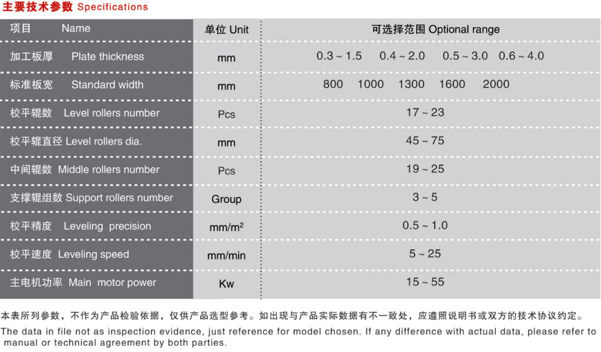 本機(jī)床是四重式校平機(jī)的升級(jí)機(jī)型。在上、下排校平工作輥與支撐輥(輪)之間各加裝進(jìn)一排中間輥,構(gòu)成上下各三重,共六重的組輥結(jié)構(gòu)。通過中間輥的過渡,支撐輥(輪)的支撐力不直接作用于工作輥,避免了四重式校平機(jī)工作時(shí),在敏感材料表面留下支撐輥(輪)壓痕的現(xiàn)象,最大程度地保護(hù)加工材料的表面狀態(tài)。主要用于校平鋁板、不銹鋼板、銅板、有色金屬板、不同金屬復(fù)合板,涂、鍍、磨工藝金屬板等對(duì)板表面要求較高的板材。校平輥受力分布均勻,結(jié)構(gòu)剛性好,工作輥繞曲變形小,校平精度高。
